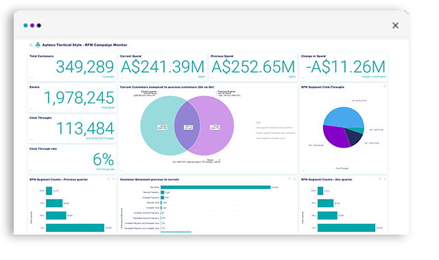 Apteco-Dashboards bieten eine klare und präzise Möglichkeit, Ihre Kundendaten oder Ihre Kundendatenplattform (CDP) zu visualisieren und mit diesen zu interagieren. In den vielfältigen Arbeitsumgebungen heutzutage benötigen Menschen intelligente, flexible Werkzeuge, um Ihre Ziele schnell und effizient zu erreichen. Jetzt können Sie ganz einfach ansprechende Dashboards mit Visualisierungen, die automatisch aktualisiert werden, inklusive ihrem Branding anpassen, um Insights in Ihrem gesamten Unternehmen zu teilen, sowie die neuesten Datenaktualisierungen widerzuspiegeln, sodass Ihr Team stets mit aktuellen Informationen arbeiten kann.