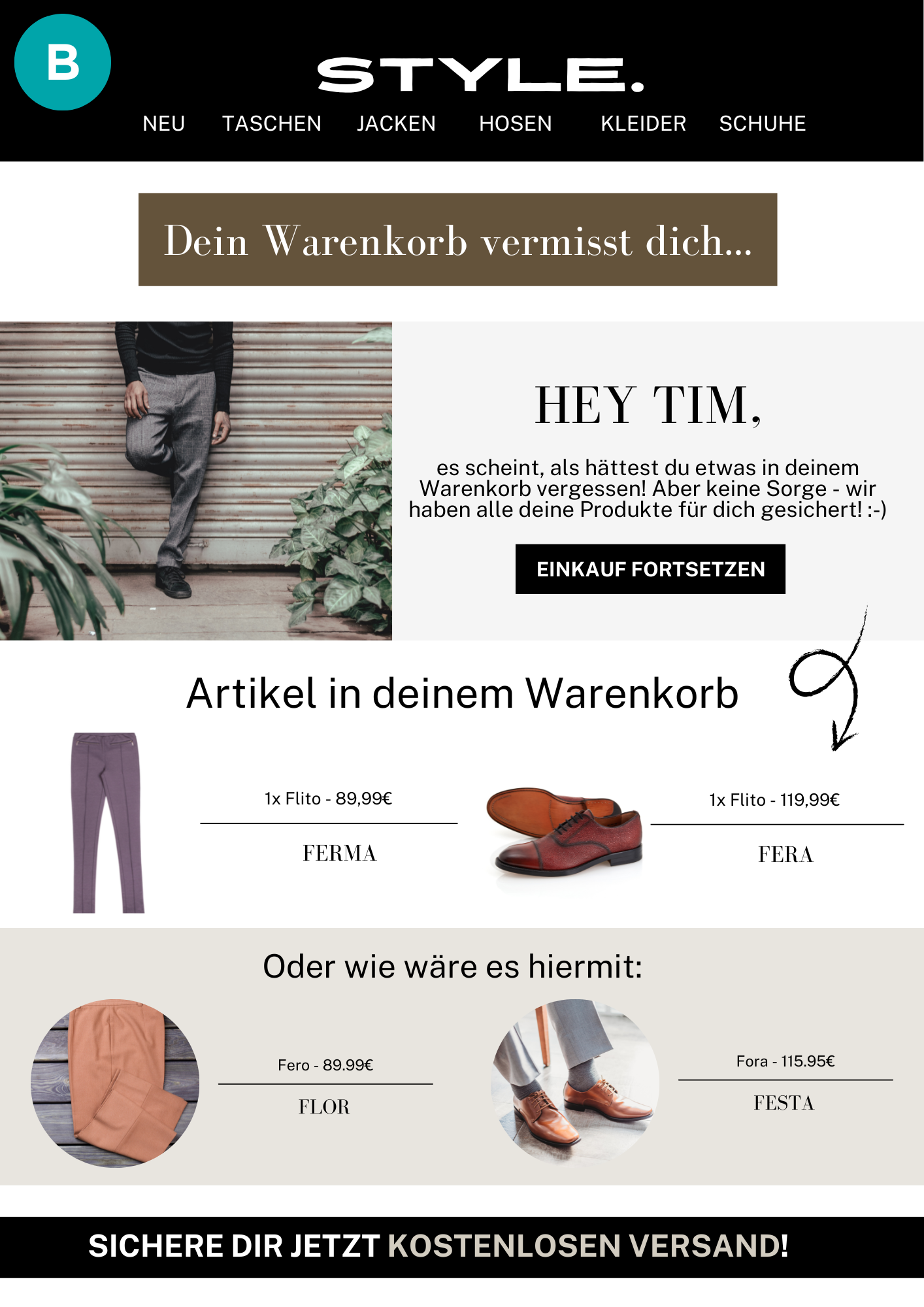 Um die Erfolgsrate einer Warenkorbabbruch-E-Mail zu steigern, sollten Sie bei der Erstellung einige Aspekte beachten. Hier sind verschiedene Beispiele: