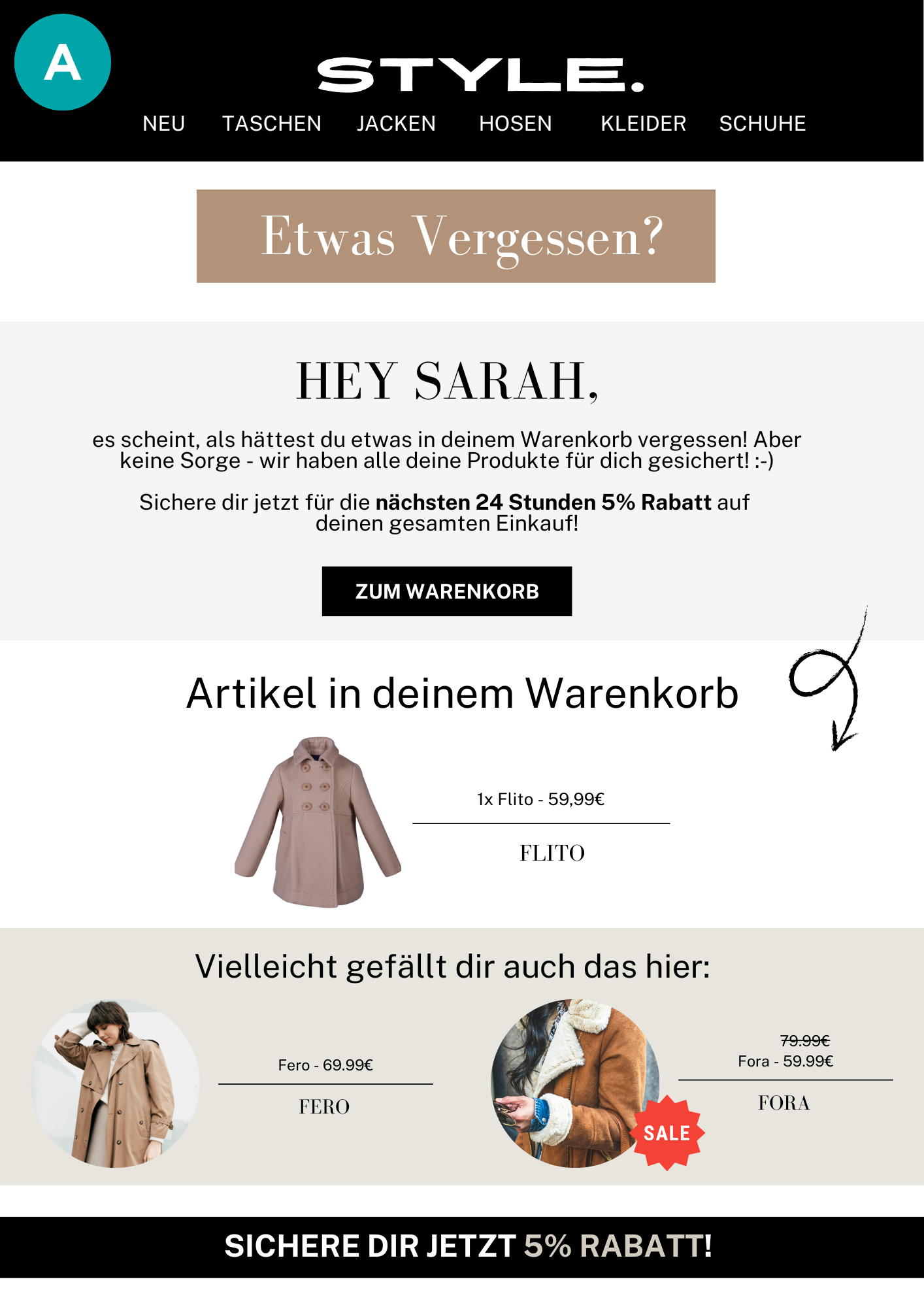 Beide Abandoned Cart Mails enthalten zu Beginn einen kurzen Betreff bzw. Header, der den Leser an den verlassenen Warenkorb erinnern soll. Direkt darauf folgt die personalisierte Ansprache des Kaufinteressenten (A & B) sowie ein individuell angepasstes Bild (B). Anschließend folgt ein kurzer Text (A & B), bei welchem ein 5%-Rabatt für 24h als Anreiz erwähnt wird. Der CTA-Button macht es dem Kunden möglich direkt zum Warenkorb zurückzukehren, sodass der Kauf abgeschlossen werden kann (A & B). Das angegebene Zeitfenster von 24 Stunden erzeugt ein Gefühl von Dringlichkeit (A). Im folgenden Abschnitt werden die im Warenkorb befindlichen Artikel angezeigt sowie weitere Produkte empfohlen (A & B), wobei auch auf einen Sale verwiesen wird (A). Zum Schluss der E-Mail bietet ein weiterer CTA in Form eines Banners Anreiz zum Kauf (A & B).