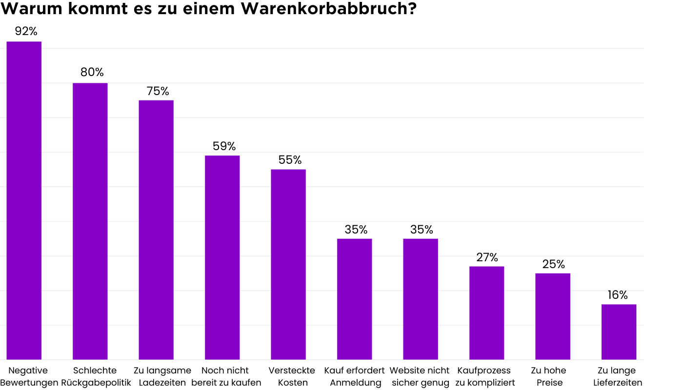Gründe dafür können beispielsweise hohe Versandkosten oder ein zu langer und komplizierter Check-out-Prozess sein. Außerdem können technische Probleme, sowie Schwierigkeiten bei der Erstellung eines Kundenkontos dazu führen, dass ein Kauf abgebrochen wird.