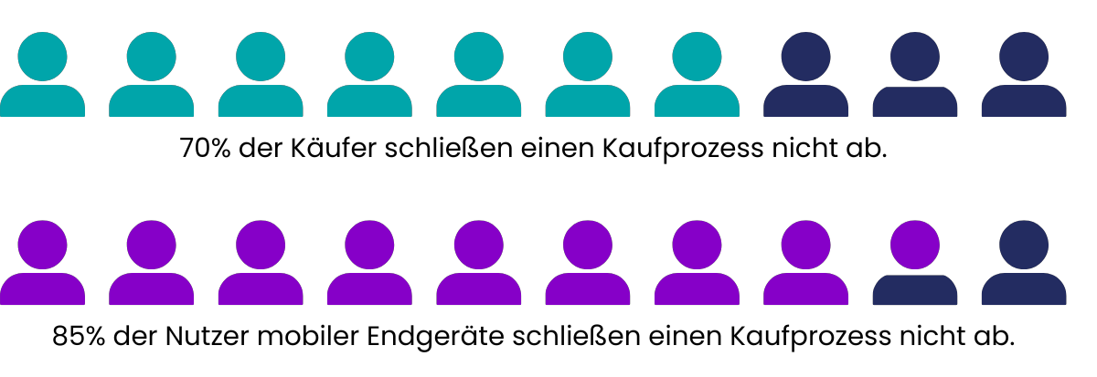 Laut dem Baymard Institute liegt die durchschnittliche Warenkorbabbruchrate bei fast 70%. Das bedeutet, dass durchschnittlich nur 3 von 10 Kaufinteressenten einen Kaufprozess abschließen, auch wenn diese zuvor Interesse gezeigt und ein Produkt dem Warenkorb hinzugefügt haben. Bei Nutzern mobiler Endgeräte steigt die Abbruchrate sogar auf über 85%.