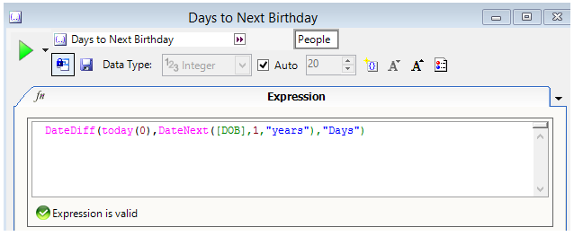 Mit einer Funktion namens „DateDiff“ kann ich nun die Anzahl der Tage bis zum zuvor berechneten nächsten Geburtstag ab heute kalkulieren. Das heutige Datum wird in der Funktion als „today (0)“ dargestellt.
