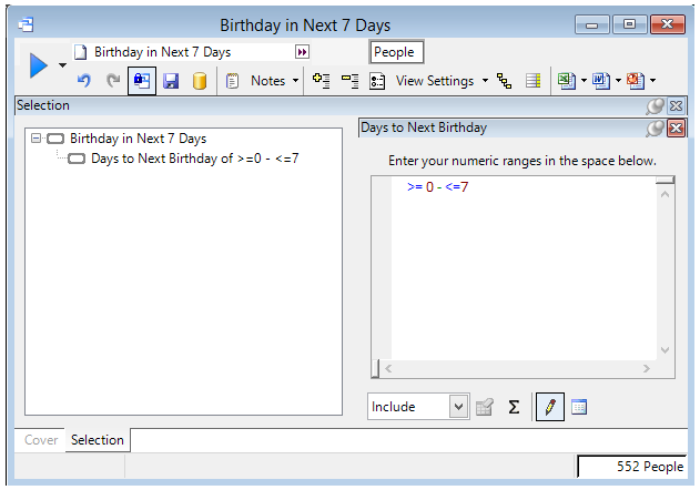 Über eine Selektion kann ich diese „Expression“ direkt nutzen, um meine Kunden zu selektieren, die innerhalb der nächsten 7 Tage ihren Geburtstag feiern. In meinem Beispiel sind es 552 Personen.